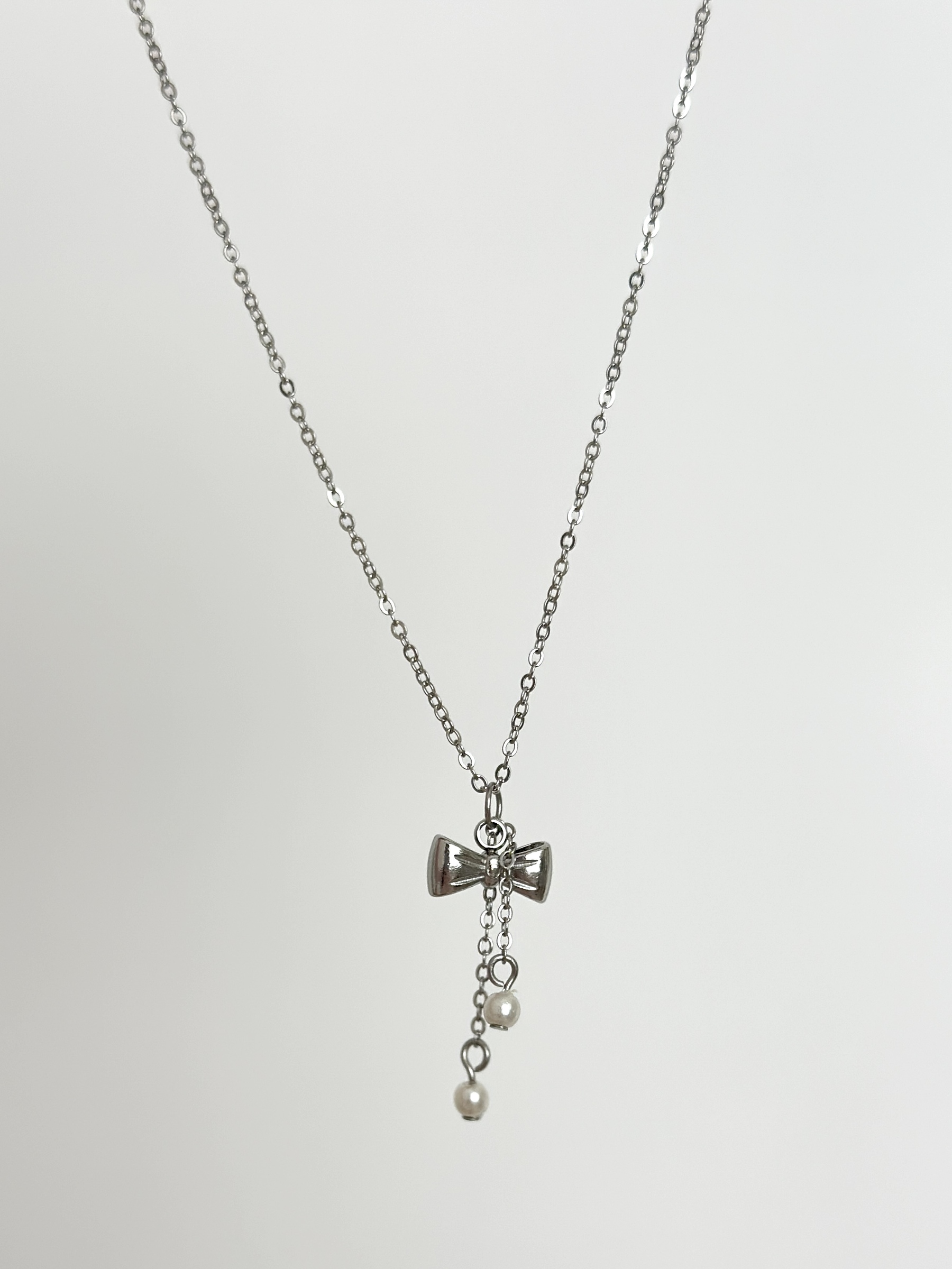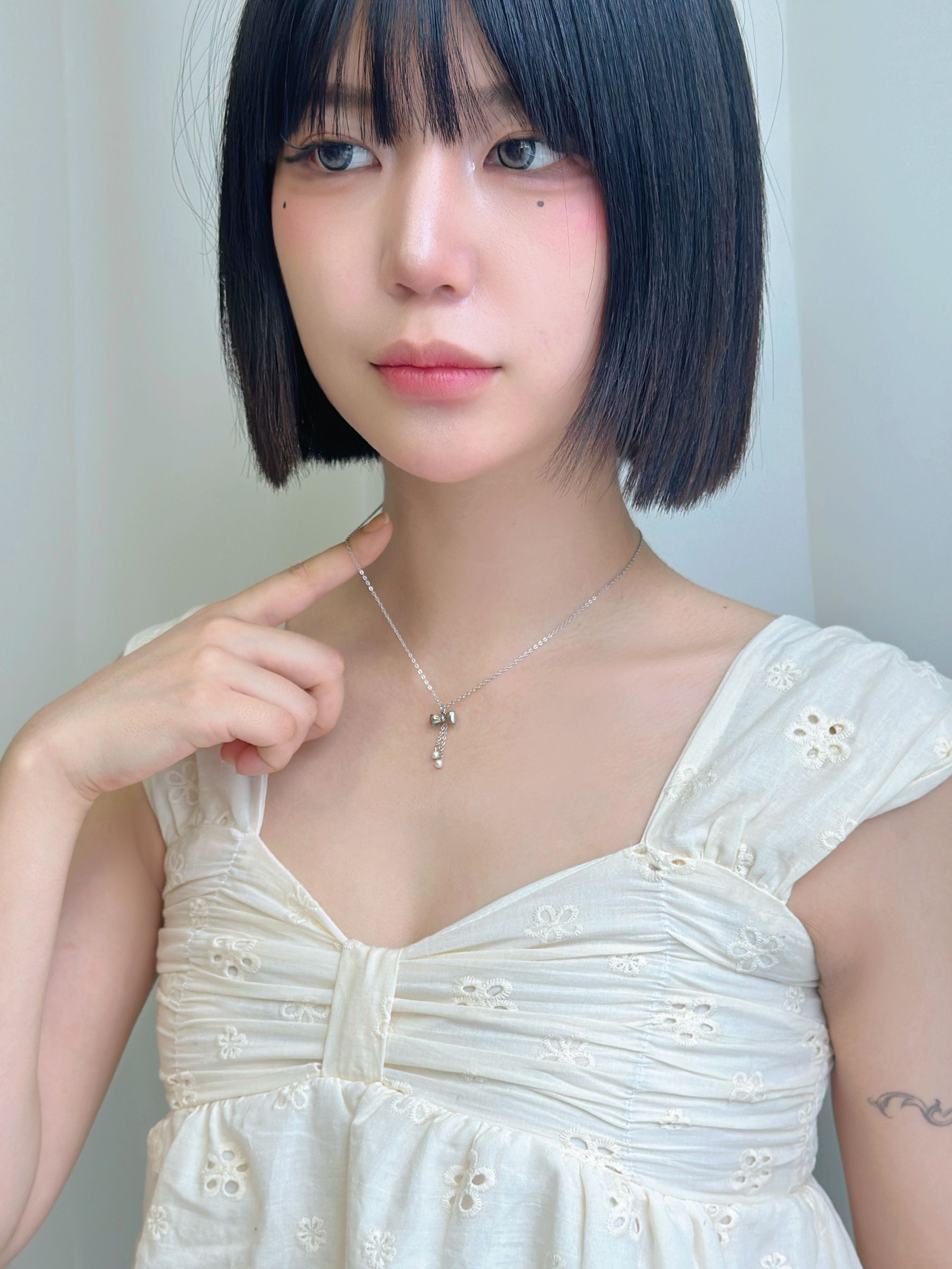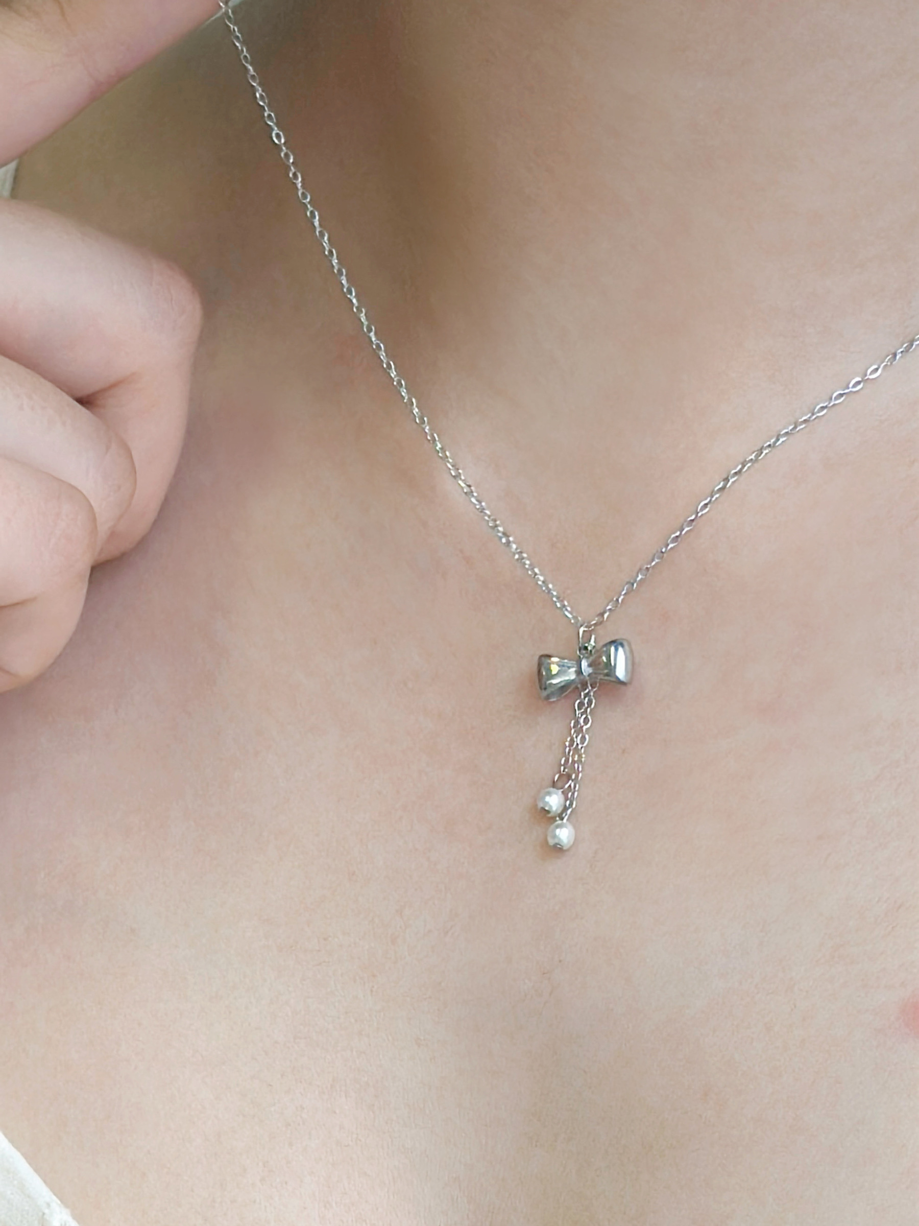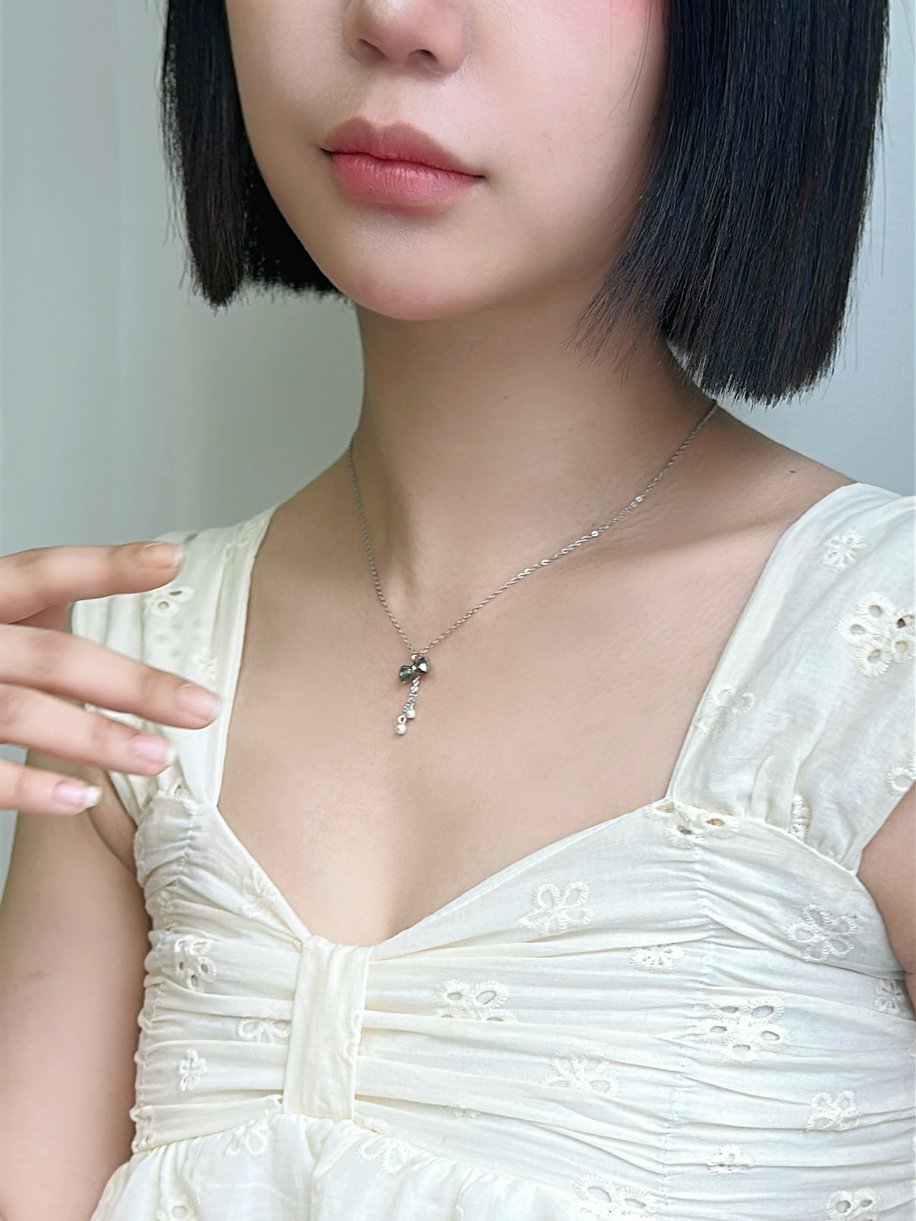 小編碎碎念:「少女必備!經典立體蝴蝶結,搭配垂墜的珍珠,走路時自然擺動,是日常漂亮又不過於彰顯的百搭項鍊。」